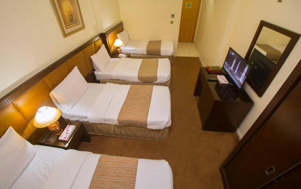 The gallery section provides a look at the upscale comfort and modern amenities of the Anwar Al Zahraa Hotel Madinah. The photos showcase air-conditioned family rooms with private balconies, spacious private bathrooms with various amenities, a lift, and a minibar.